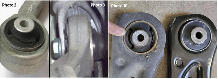 (Comparações destacando buchas novas e intactas versus buchas desgastadas e danificadas.)