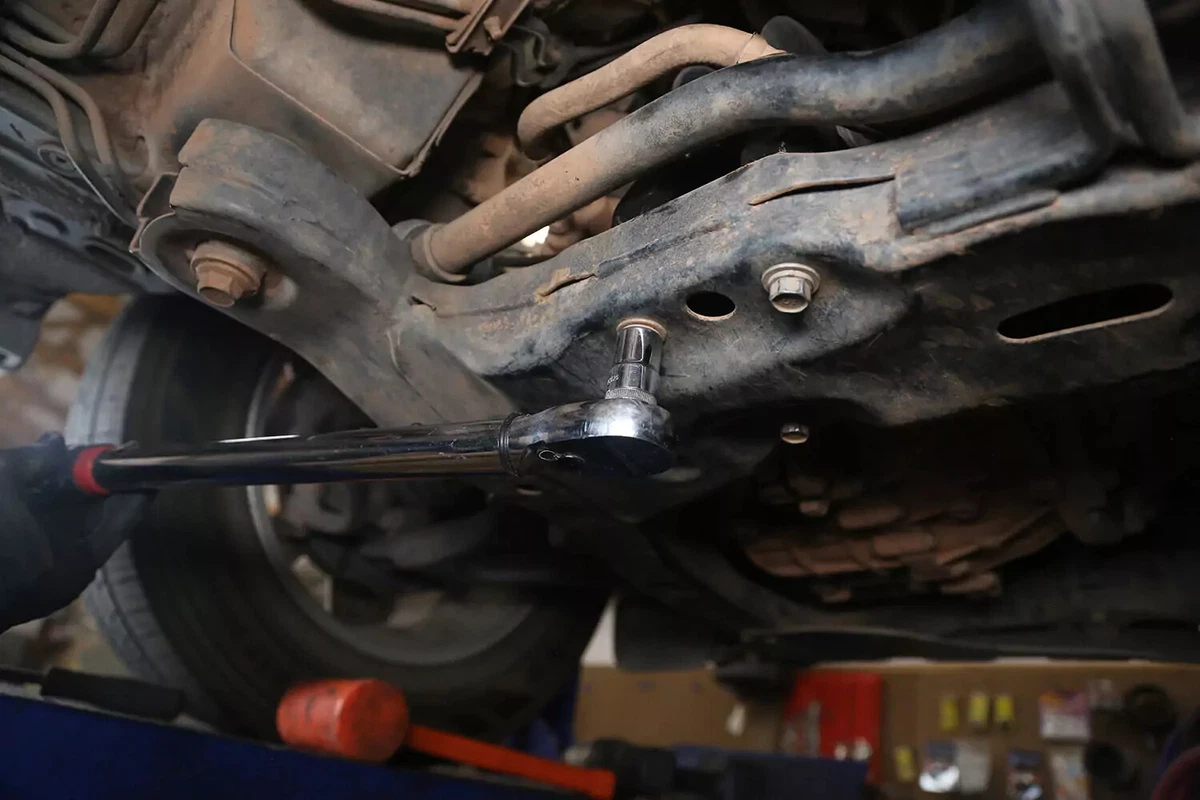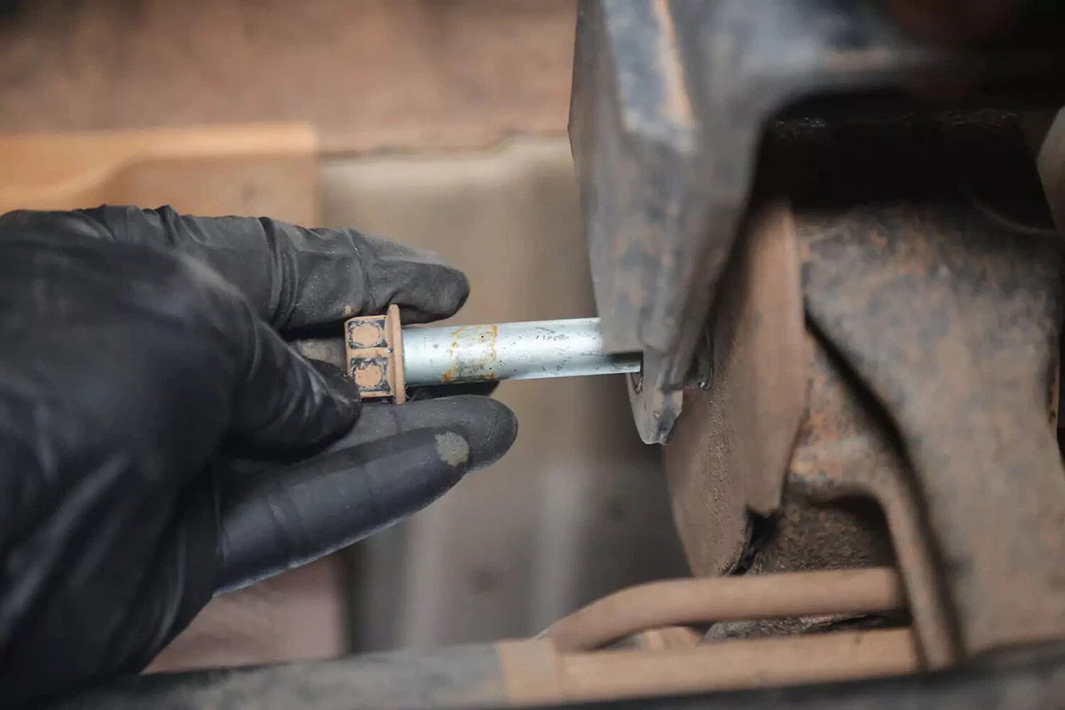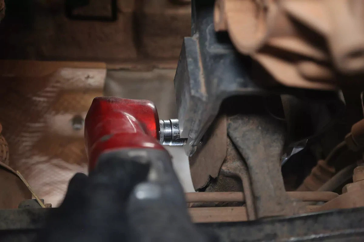 Nosso veículo de demonstração possui um parafuso cruzado, que é removido com uma chave inglesa de um lado e um soquete do outro. Eles podem ser difíceis de remover em locais apertados. Use uma barra disjuntora, chave de impacto ou barra trapaceira para obter a alavancagem necessária.