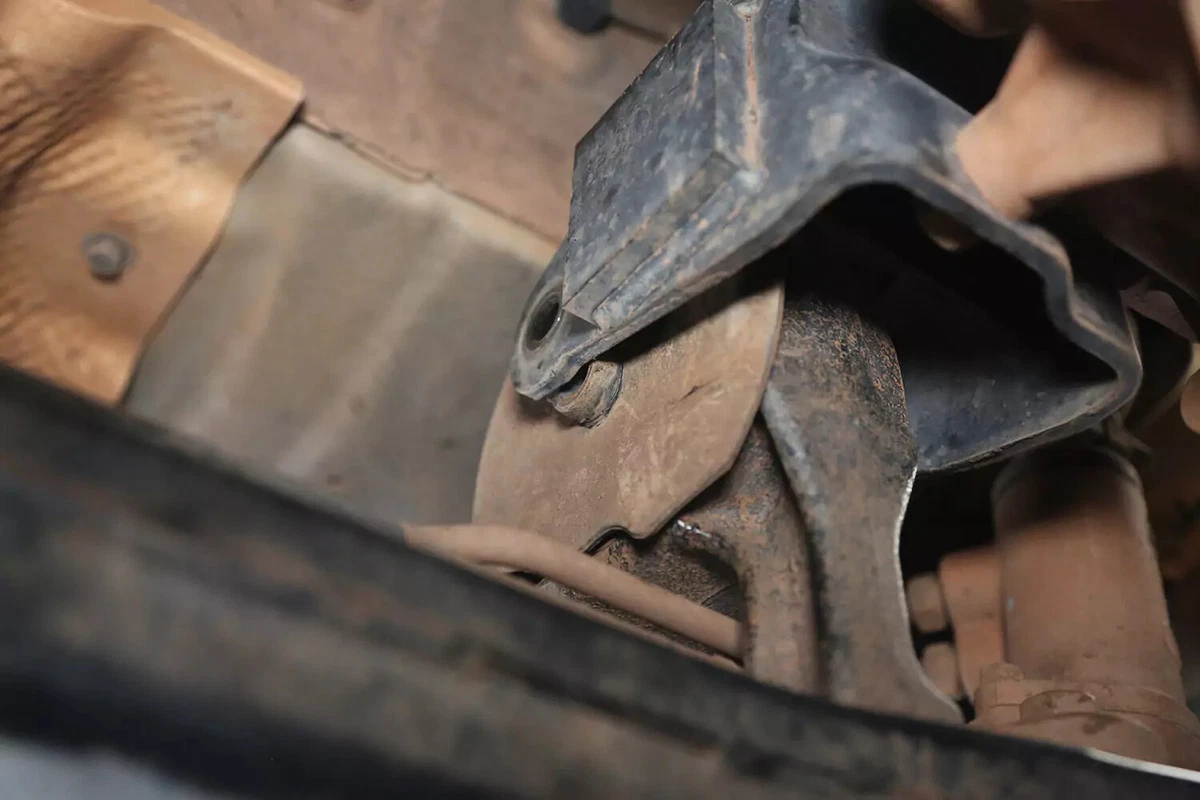 Em nosso veículo de demonstração, existem entalhes de suporte que prendem o suporte no suporte de montagem da transmissão. Precisávamos aplicar sustentação extra para liberar a montaria.