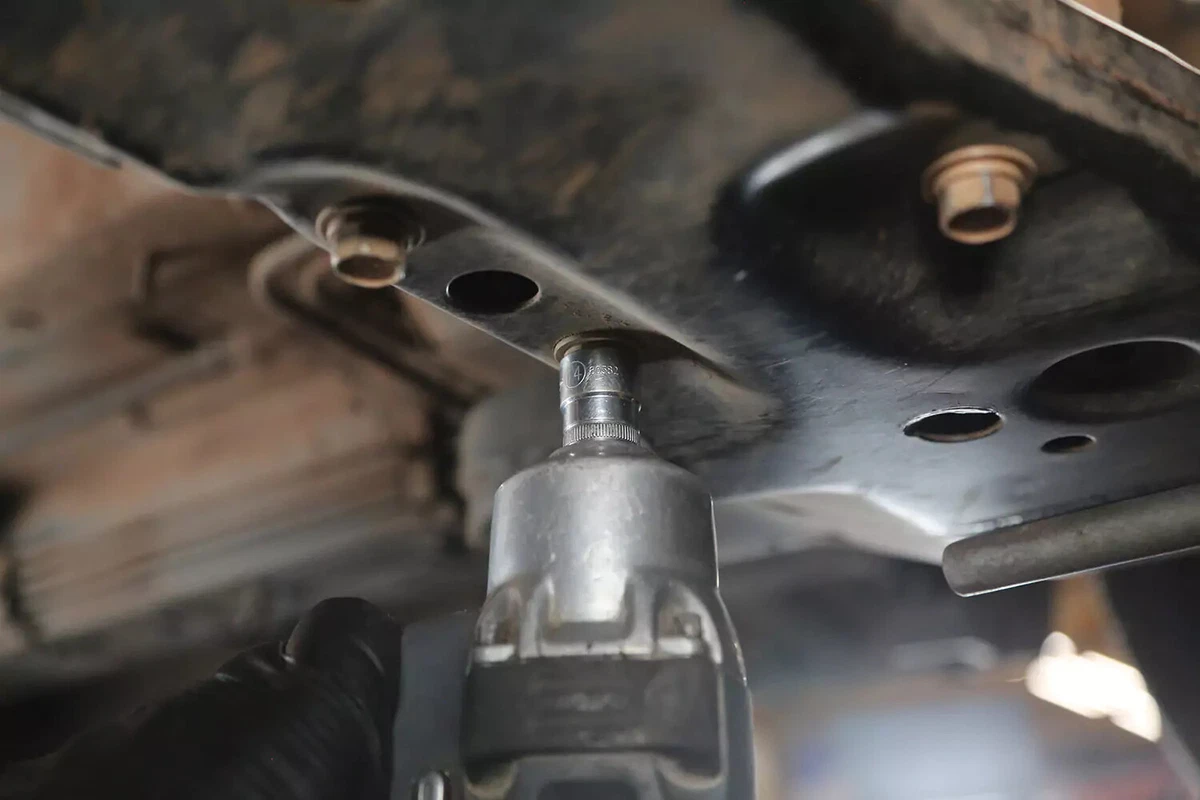 Afrouxe os parafusos de montagem da transmissão. Deixe-os no lugar por enquanto.
